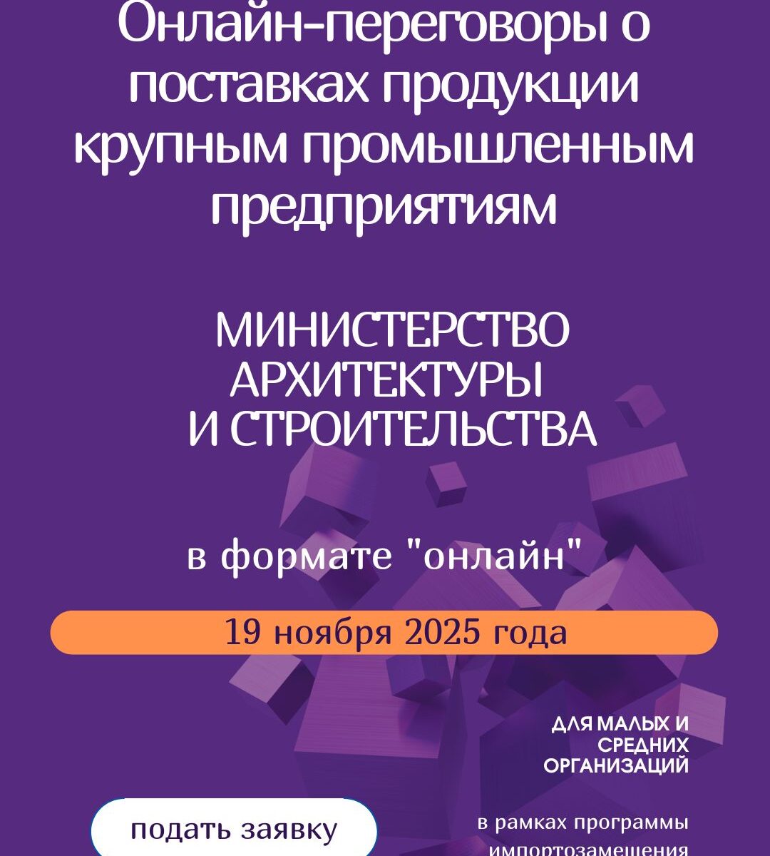 19 ноября 2025 года с 10:00 до 12:00 часов в рамках контактно – кооперационной биржи планируется проведение онлайн-переговоров с организациями Министерства архитектуры и строительства Республики Беларусь: РУП «Управляющая компания холдинга «Белорусская стекольная компания» (ОАО «Гомельстекло», ОАО «Стеклозавод «Неман», ОАО «Гродненский стеклозавод», ОАО «Белмедстекло», ОАО «Гродненский стеклозавод филиал «Елизово») и РУП «Управляющая компания холдинга «Белорусская цементная компания» (ОАО «Белорусский цементный завод», ОАО «Красносельскстройматериалы», ОАО «Кричевцементношифер»).