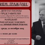 22 октября МАРЕЦКИЙ ЮРИЙ БРОНИСЛАВОВИЧ проведет личный прием граждан и представителей юридических лиц