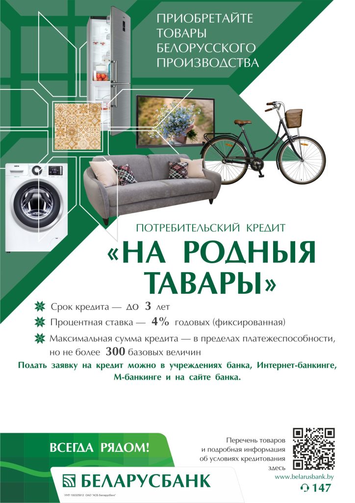 Поддерживая инициативу правительства Республики Беларусь по стимулированию розничной торговли товарами белорусских производителей, с 4 января Беларусбанк запустил новый кредит на потребительские нужды «На родныя тавары». Ставка по нему — всего 4 %.