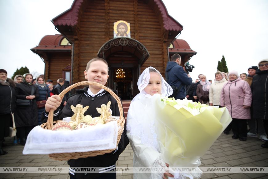Президент Беларуси Александр Лукашенко на Пасху приехал в храм Святителя Николая Чудотворца в агрогородке Евдокимовичи Шкловского района, передает корреспондент БЕЛТА.