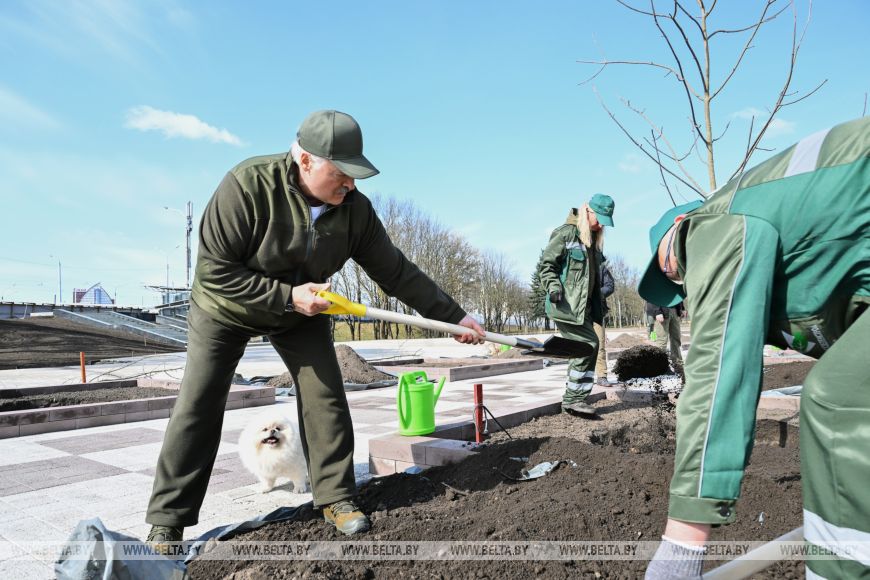 Президент Беларуси Александр Лукашенко во время республиканского субботника работал на площадке Национального исторического музея и парка Народного единства, передает корреспондент БЕЛТА.