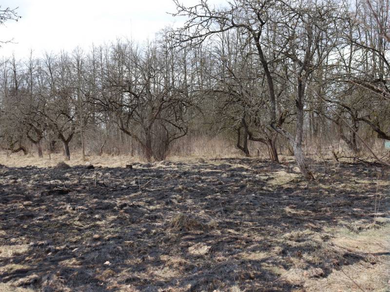Первая остановка вблизи деревни Шипяны. Кто-то поджог прошлогоднюю траву. Огонь быстро распространился и даже добрался до старого сада. Возможно, спичку или незатушенную сигарету бросили местные жители.