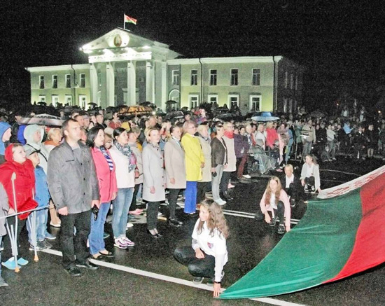 В 22:55 смолевичане присоединились к общереспубликанской акции «Поем гимн вместе». Горожане и гости праздника в унисон со всей страной исполнили главный музыкальный символ Республики Беларусь – национальный гимн, после чего ночное небо раскрасил праздничный салют.